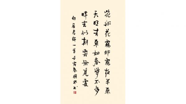 像花不是花,像雾不是雾。半夜时分到来,天亮以后离去。来时像春梦一样短暂,离开时像朝云散尽,找不到行踪。朱金城在1988年出版的《白居易集笺校》说〈花非花〉作于823年以前,也就是白居易大约50岁时。中年回想少年,心也悠悠,情也悠悠。1935年黄自谱曲,不同年代的歌手唱了几十年,欢乐的时光短暂,磨难的时光漫长,款款深情,听者理解。
