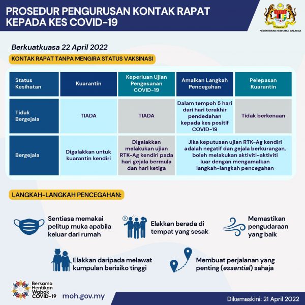卫生部长凯里上周召开新闻发布会时宣布,没有症状的密切接触者只需要在接触冠病患者的5天内做好预防措施,包括戴口罩外出、避免前往拥挤的地方、避免探望高风险群体、确保空气流通良好,以及确保仅处理重要事务即可。