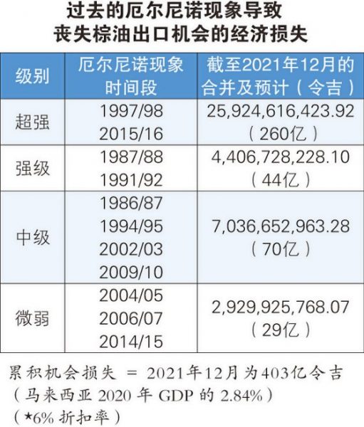 单单是以往3次微弱级的厄尔尼诺现象,马来西亚油棕业便损失了29亿令吉;4次中级造成的损失为70亿令吉;两次强级的损失为44亿;两次超强级的损失便高达约260亿令吉。他们再加上每次厄尔尼诺现象的时长仔细估算,油棕业的损失每分钟可达数百至数千令吉。以极强级别的2015/16为例,其周期长达25个月,每分钟损失高达8549令吉61仙!