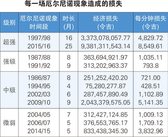 此外,他强调,也切勿轻视微弱级别的厄尔尼诺现象,因为依据他们的估算,3次微弱级分别造成的亏损总和可能比部分中级厄尔尼诺现象的经济损失来得更高。