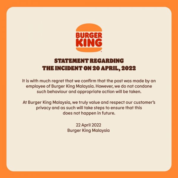尽管短片已被删除,不过汉堡王今日在脸书帖文表示对此事感到遗憾,并强调该公司不会容忍员工的这种行为,答应会采取适当的行动处理此事。
