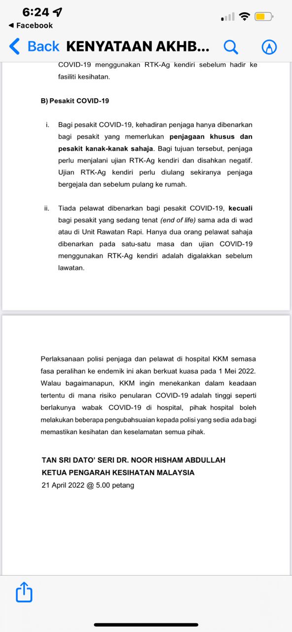 文告指出,探访者和监护人也必须是非疑似感染者或受监督者(PUS),并且没有出现冠病症状,以及须填写冠病申报表并遵守标准作业程序(SOP)和穿戴个人防护设备(PPE)。