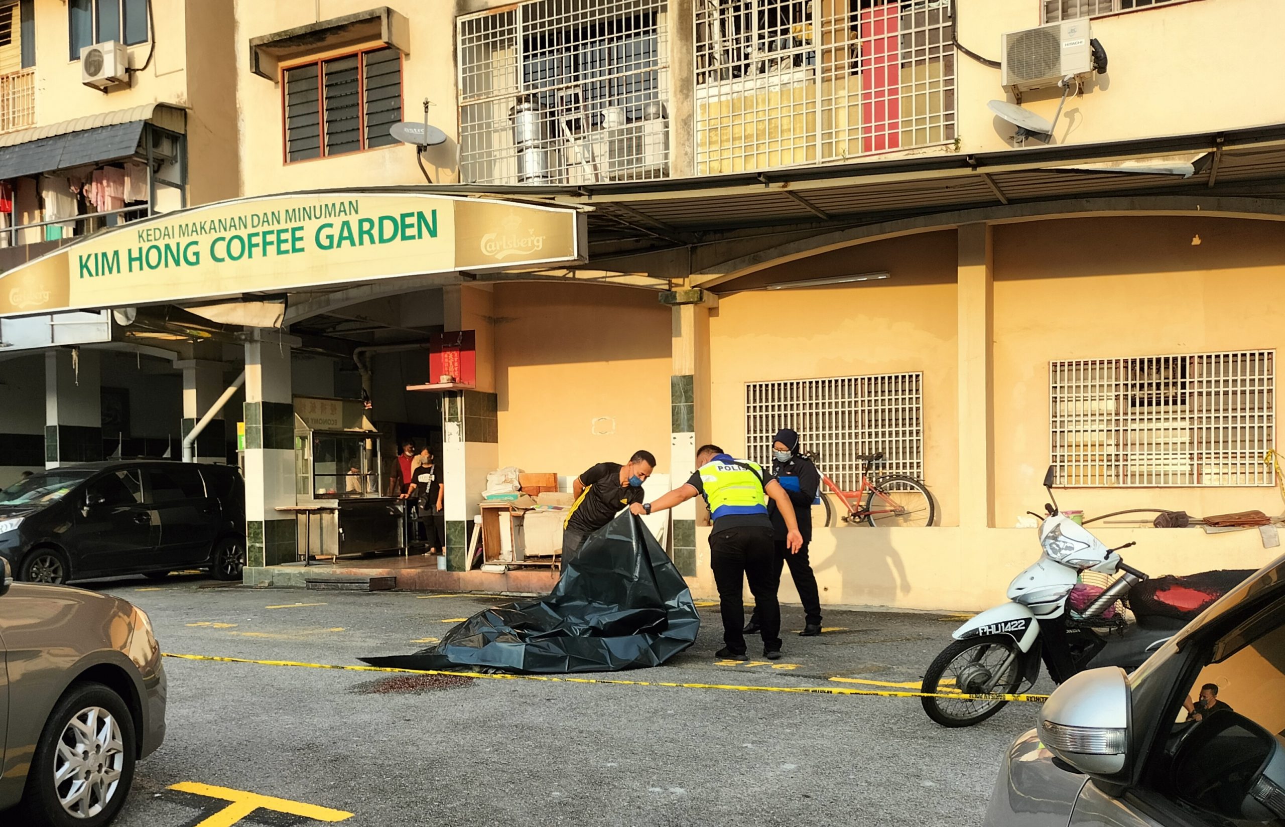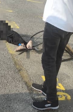 (槟城22日讯)一名左脚拴着铁链与椅子的男子,从8楼坠下,压到一名路过居民后,再坠地