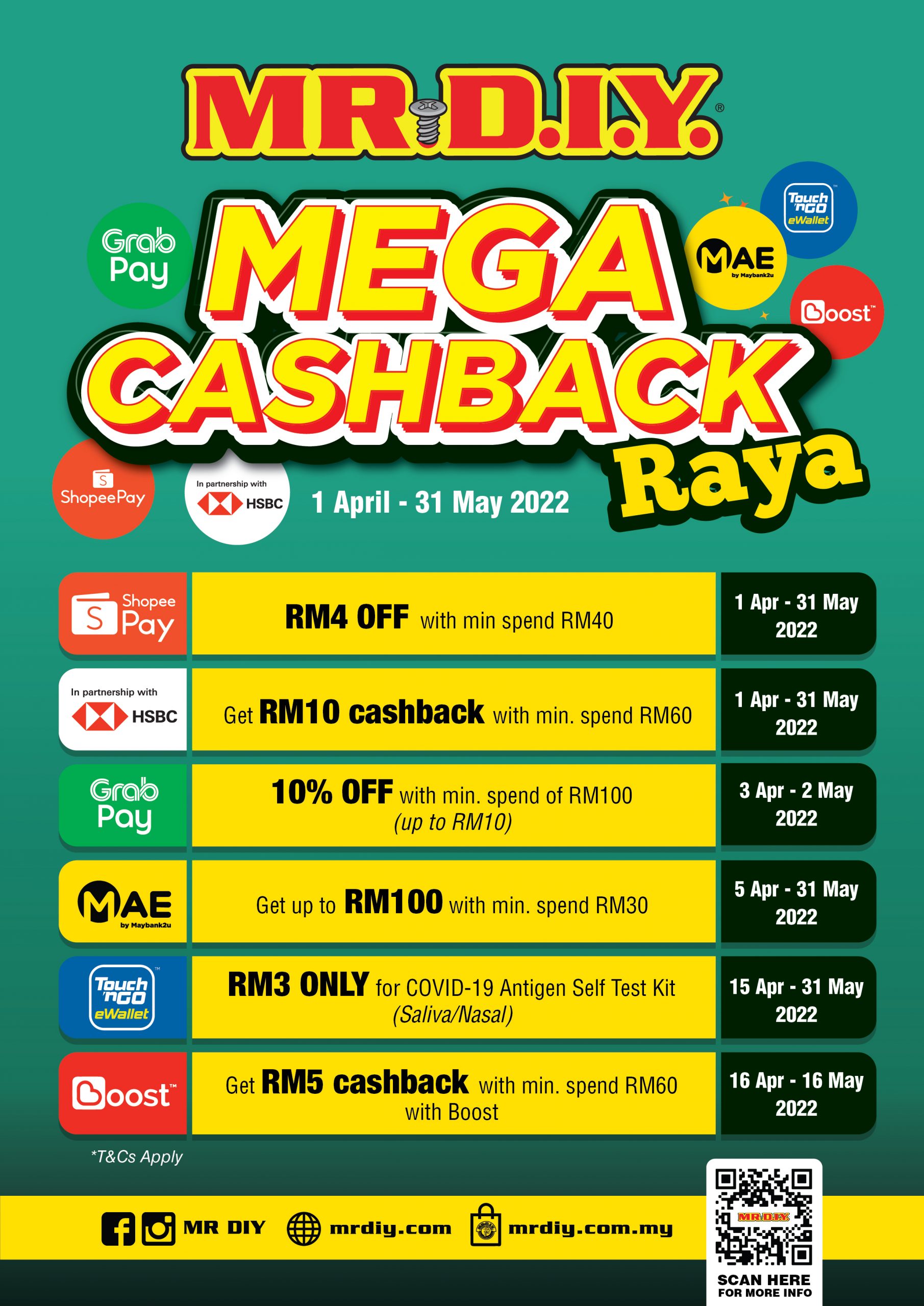 这项巨额现金回赠活动与MR. D.I.Y.目前的“全新的开斋节”(Raya Serba Baharu)活动同步进行。更多详情,请浏览https://www.mrdiy.com/promotion/327/MR.DIY-Mega-Cashback-2022/。