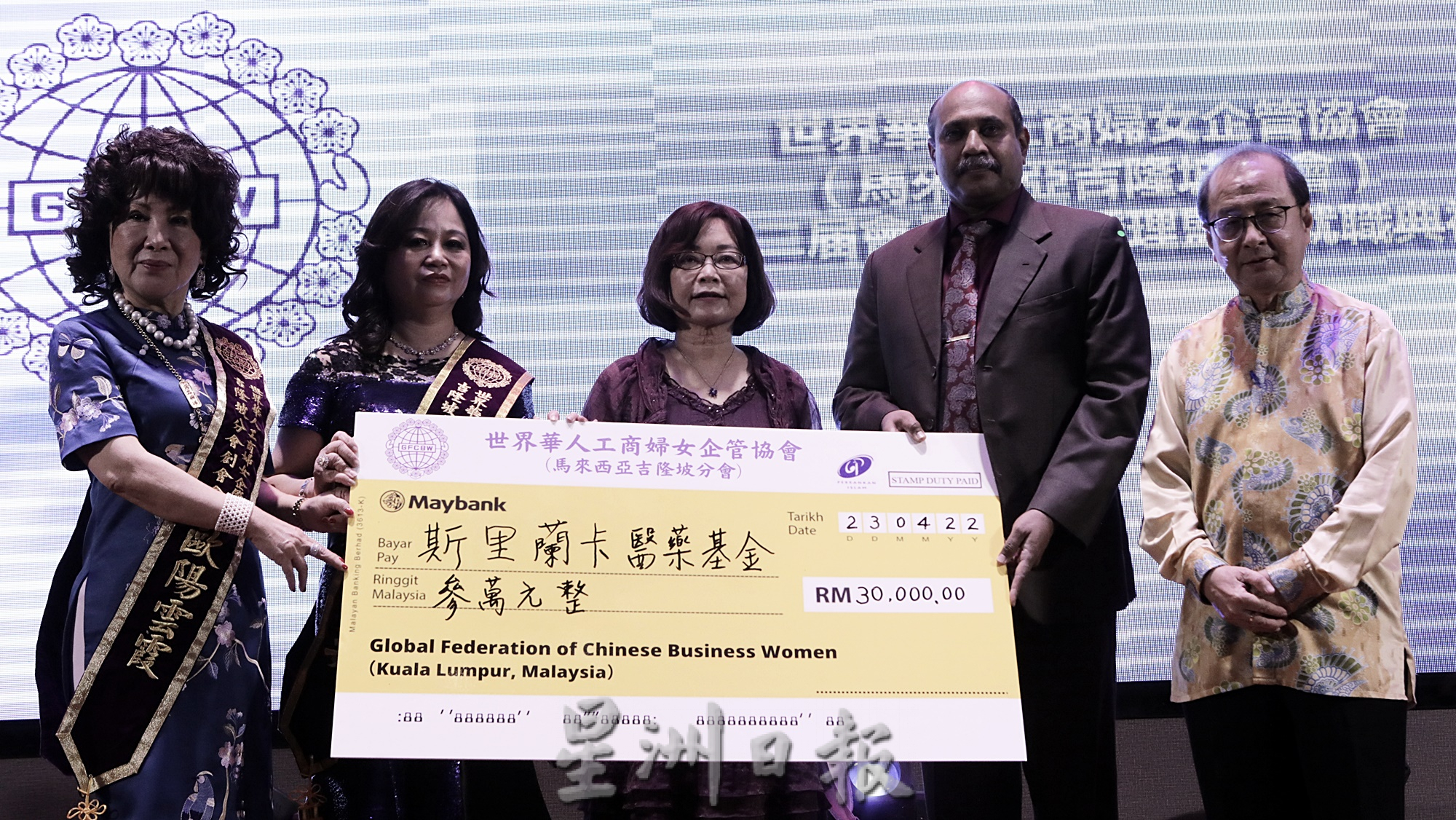 (八打灵再也26日讯)配合世界华人工商妇女企管协会吉隆坡分会2022年第二届会长暨理监事交接典礼的举行,该组织捐献斯里兰卡国际医疗援助3万令吉善款给星洲日报基金会,并由基金会执行长刘昆昇代表接领。