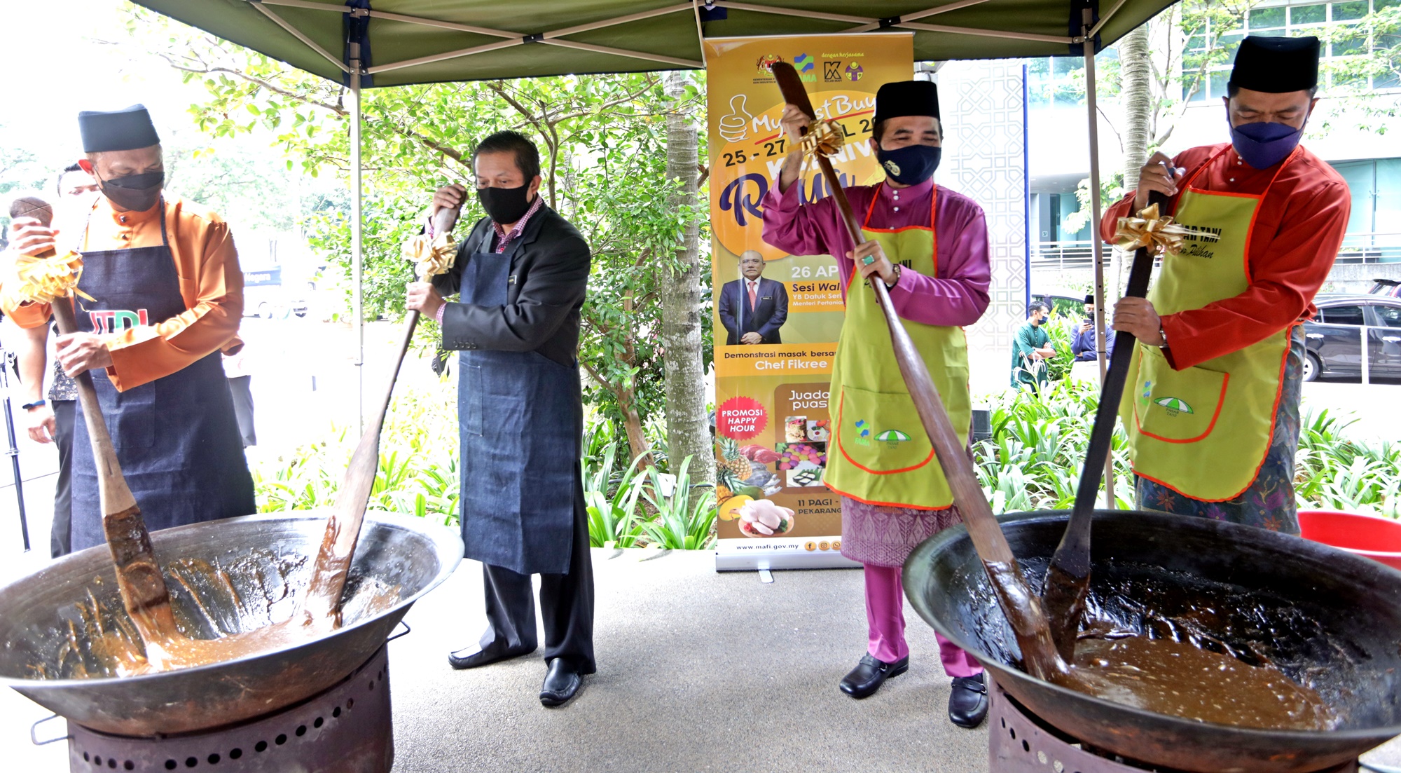 扎瓦威(右二)在My Best Buy活动上示范烹煮椰子软糕(Dodol)。左起是卡马巴林及慕斯达法。右为巴哈鲁丁希山。(蔡伟传摄)