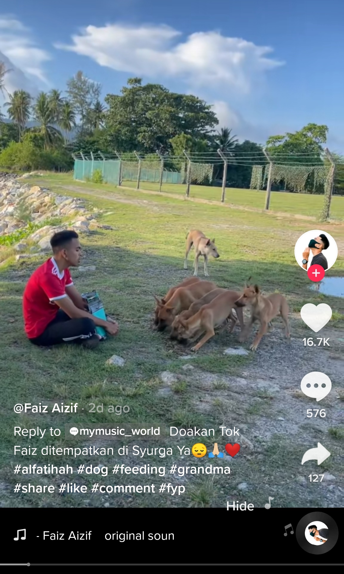 据巫青法依艾兹近日上传到抖音的短视频,他日前在浮罗交怡机场附近开斋时,遇到一群看似非常饥饿的流浪狗,对它们心生怜悯,当时便去购买狗粮折返喂这群流浪狗。
