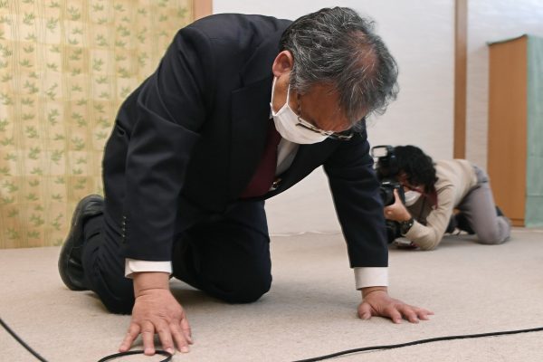 日本北海道观光船23日发生船难,至少11人罹难,仍有15人下落不明。失事船公司“知床游览船”社长桂田精一(图)星期三现身召开首场记者会,并跪地致歉约10秒。