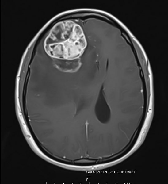 一开始小霞以为自己食物中毒,去急诊部挂号,做了断层扫描后,才发现有脑肿现象。脑部消肿后,再做磁力共振扫描,这才清楚看到右脑前方长了一颗网球般大的肿瘤,压迫右脑,造成善忘、头晕、头痛、精神散漫等问题。巨形肿瘤也造成右脑往左脑的方向推挤,导致脑水肿和颅内压增高。