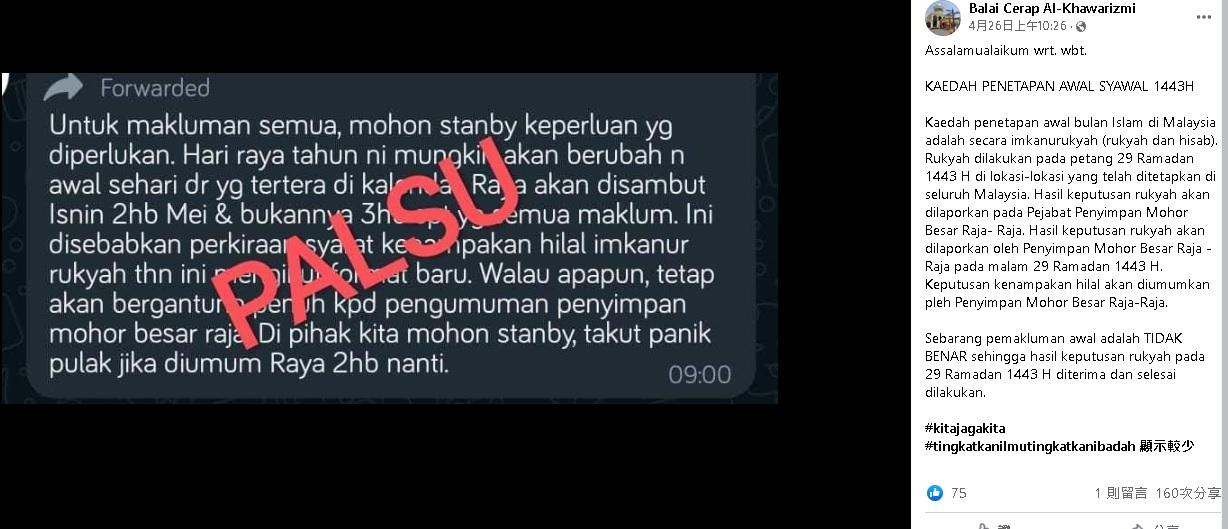 马六甲州宗教司局(Balai Cerap Al-Khawarizmi)于4月26日在脸书专页发布帖文,针对社交媒体上流传指开斋节可能会提前落在5月2日,而非3日的帖文,打上“假消息”(PALSU)标志。