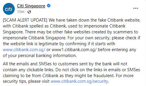 该银行说,为了用户的个人安全,输入任何个人银行资料前,需检查网站链接是否是以www.citibank.com.sg/或www1.citibank.com.sg/开头,检查网站链接是否合法。