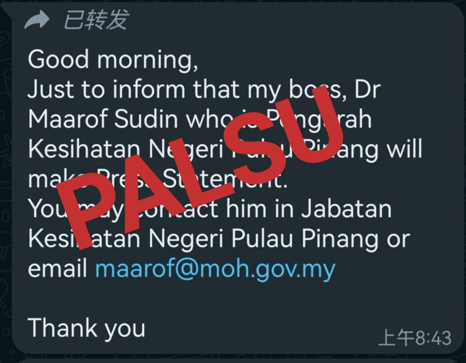 然而,槟州卫生局局长对此在脸书发文,表示有关的流传讯息是假的!