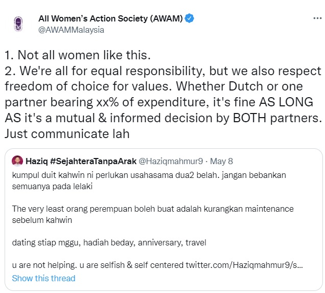该组织在转发哈兹的推文时写道,不是所有女人都只要求男方全付所有费用。