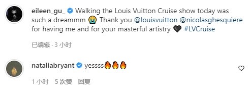此外,谷爱凌还更新了自己的INS,并感谢路易威登以及知名服装设计师尼古拉-盖斯奇埃尔。值得一提的是,当天也在走秀现场的科比大女儿娜塔莉亚还在该动态下留言,为谷爱凌点赞。