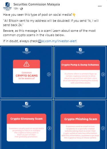 大马证券监督委员会昨天在社交媒体发文,并上传资讯图举例3个常见的加密货币诈骗,促请民众警惕类似的诈骗信息。