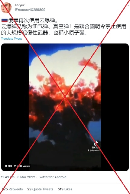 微博用户于3月3日在推特上传一段TikTok视频,在推文写道:“俄军再次使用云爆弹。云爆弹又称为油气弹、真空弹!是联合国明令禁止使用的大规模杀伤性武器,也称小原子弹。”