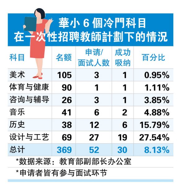 他接受星洲日报访问时说,在一次性招聘教师计划下,华小组共有6个冷门科目,录取率最低的是美术,一共开放105个名额,申请者只有3人,最终录取一人,仅占开放名额0.95%。其次是体育与健康,共开放90个名额,共一人申请,录取一人,占1.11%。