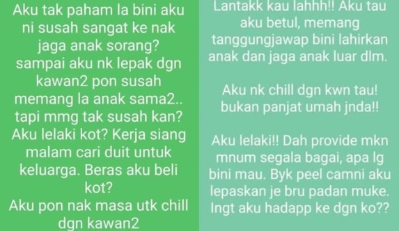 根据《Kosmo》报道,男子在贴文中抱怨妻子经常不让他出去跟朋友聚会,“我不明白,妻子独自照顾孩子有多难?以致我跟朋友聚会也很难。”