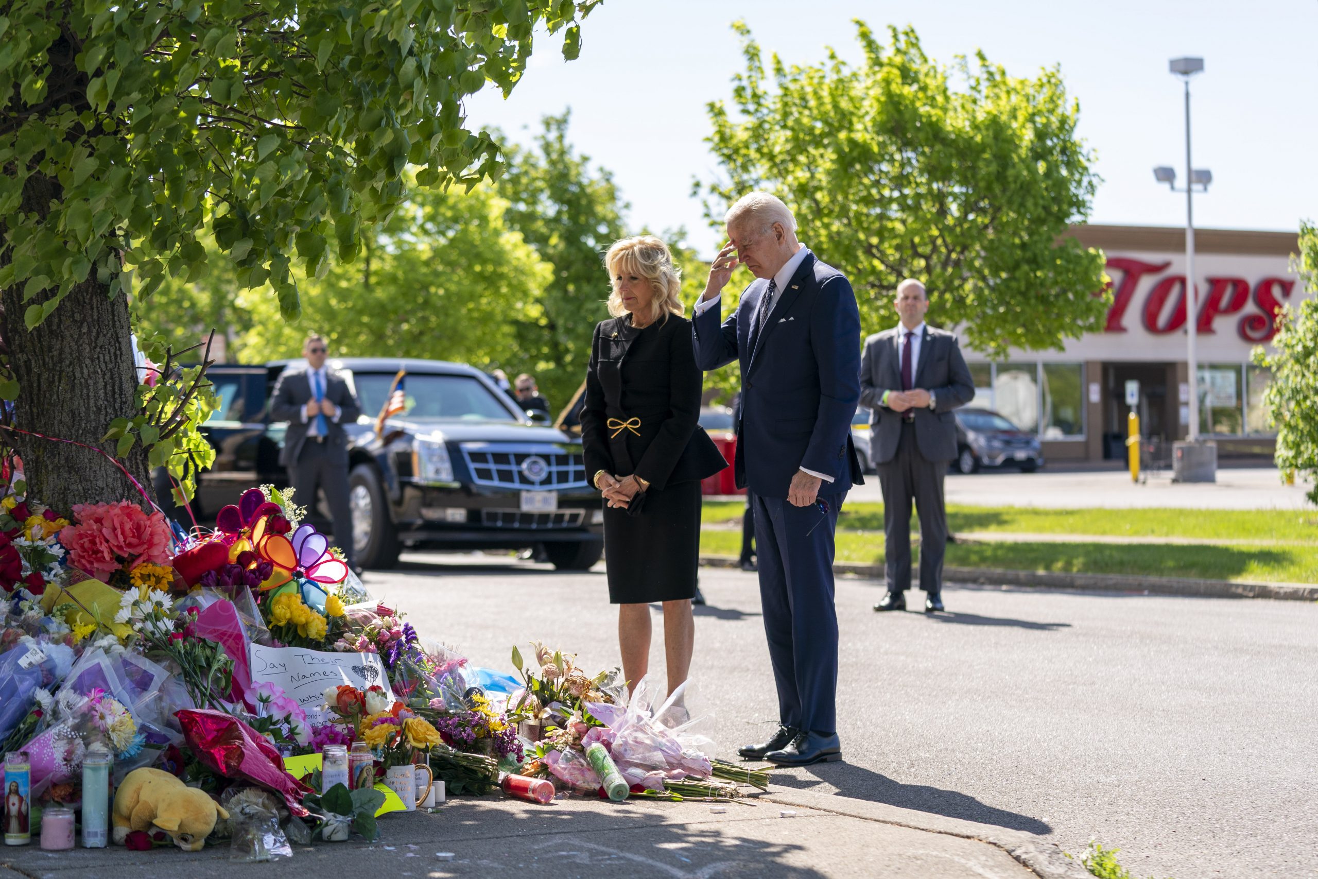 拜登和夫人吉尔当天到发生枪击案的超巿外献花,悼念遇害者,并会晤死者家人及地方官员。他随后在发表电视讲话。