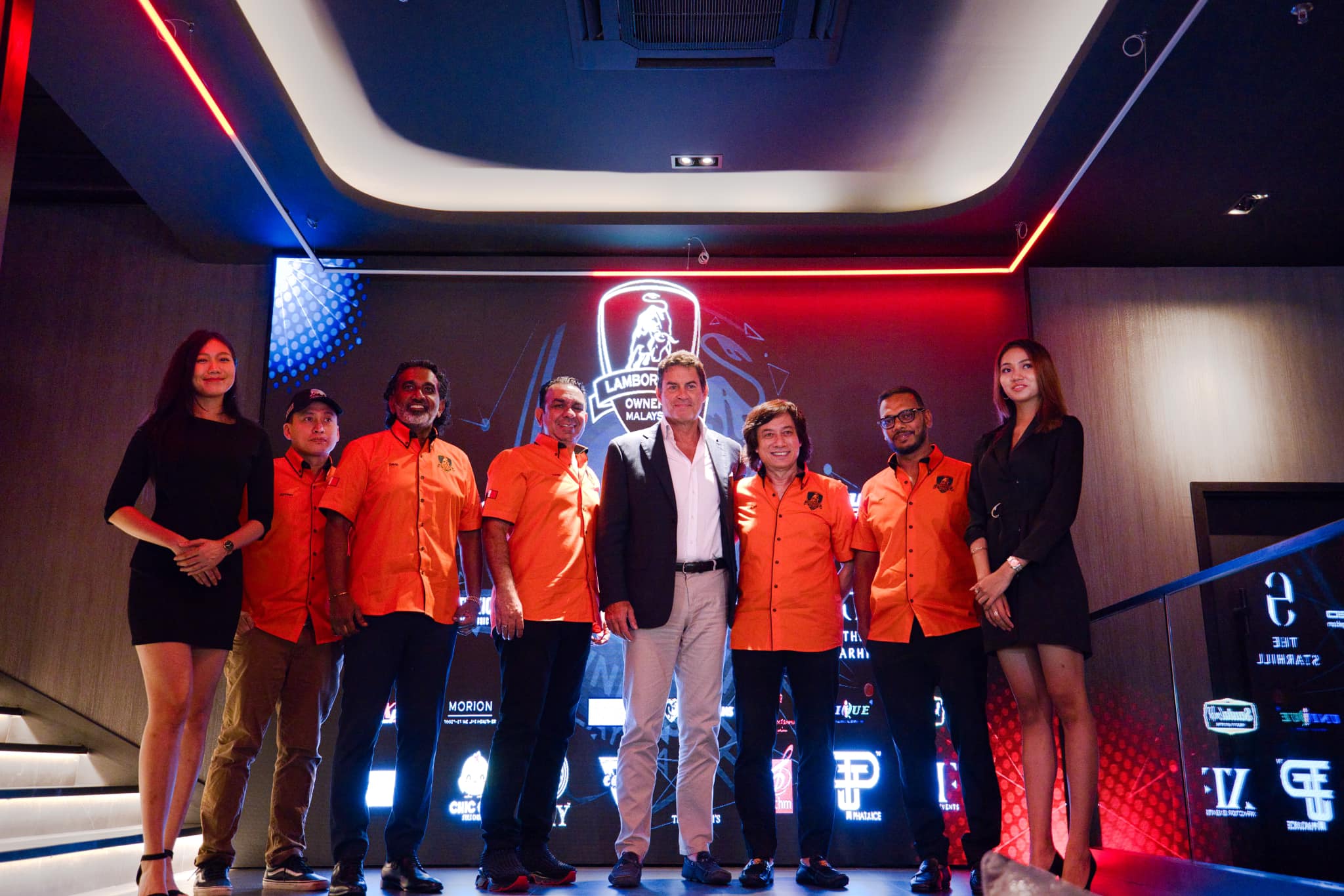 马西莫(右四)与罗斯兰(右三)在新闻发布会后,在其他成员及模特儿的陪伴下合照。(取自大马兰博基尼车主脸书)