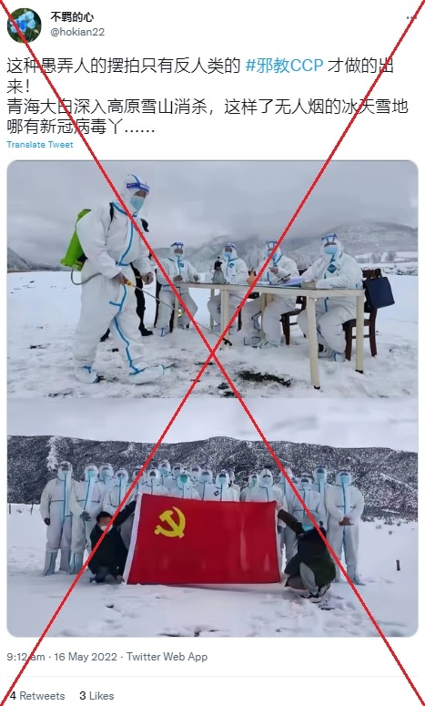 一名推特用户于5月16日发布推文,声称身穿防护服的医疗人员身处青海省西北部的偏远山区中,在一片白雪茫茫中进行冠病消毒行动。