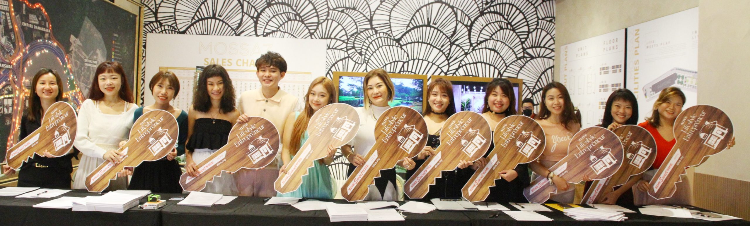 (Alive Group)10名员工日前收到出席“下午茶聚”的邀约,不疑有他地乘坐专车前往目的地,怎知却被载至奕心集团销售厅,抵达后才得知是该集团创办人郑莉凌精心准备的10间房产签约仪式,让大家惊喜万分。