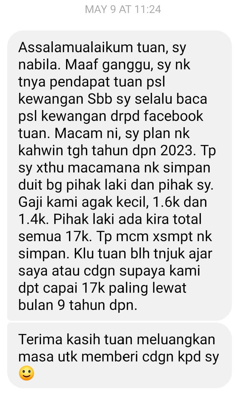 她说,她和男友的薪水都很低,月入分别只有1600令吉和1400令吉,可是婚礼费用估计需要1万7000令吉,两人担心来不及存钱。她希望阿兹祖可以提供意见,如何可在明年9月前,存够1万7000令吉结婚。