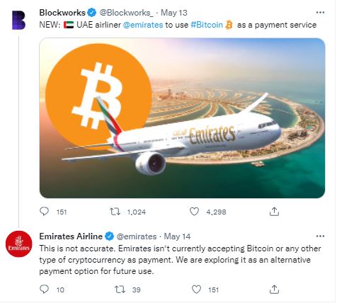 阿联酋航空隔天在推文回应说,上述消息并不正确,并表示该公司目前不接受比特币或其他类型的加密货币作为付款方式。
