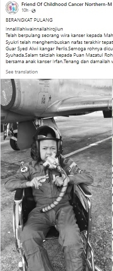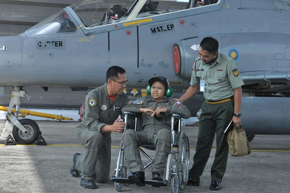大马皇家空军日前在脸书帖文,指北马儿童癌症协会向军方表明穆哈马依范米卡尔的父母,希望能完成孩子(家中排行第四)的心愿,于是北海空军基地第15中队及在空军学院的协助下,执行社会责任,以完成他的愿望。