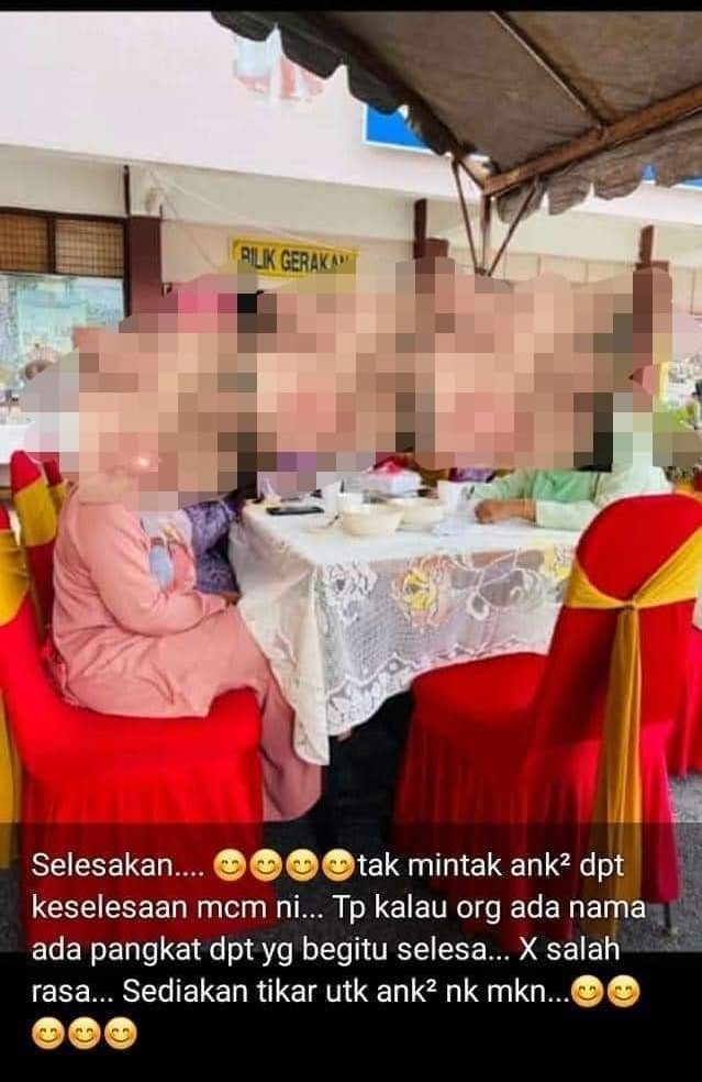 (八打灵再也22日讯)一所学校被发现在举办教师节活动时邀请了贵宾(VIP)出席,贵宾与老师们被安排坐在装饰华丽的桌椅上用餐,学生们却只能盘腿坐在食堂地板上吃饭,引起争议。