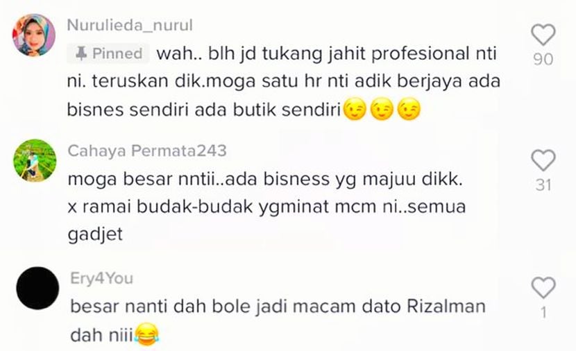住在森美兰州新那旺的阿米拉表示,为了鼓励儿子继续朝他做生意的方向迈进,她还送了儿子一台迷你缝纫机作为礼物。