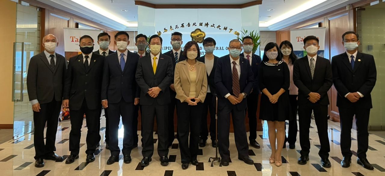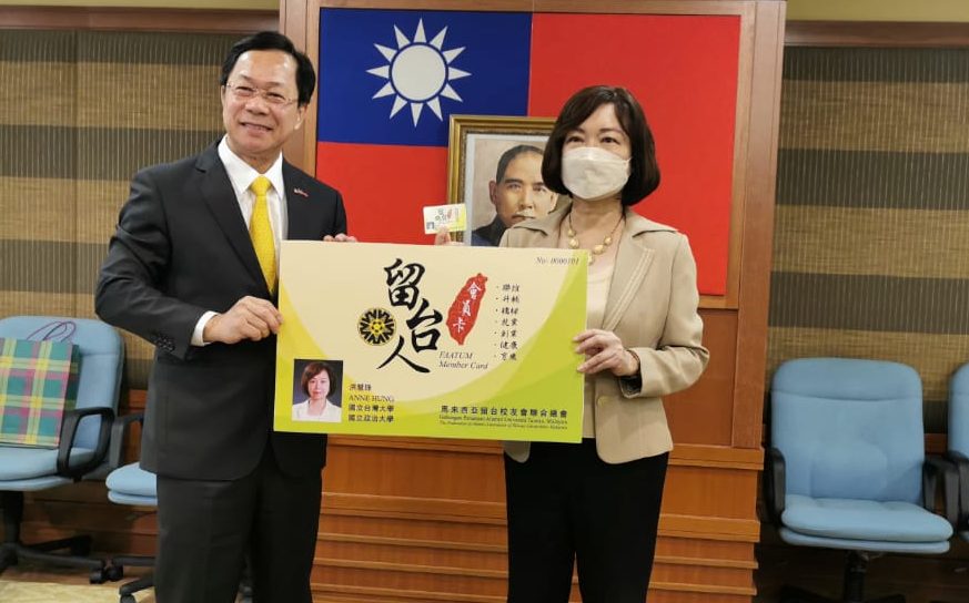 (吉隆坡22日讯)马来西亚留台校友会联合总会第25届会长拿督陈荣洲率领团队礼貌拜会驻马来西亚台北经济文化办事处代表洪慧珠,与她交流,并致赠编号101号的留台人卡。