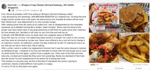 但凯恩的经历并不是唯一的。几天后,另一位名叫保罗的脸书用户到4Fingers位于乌节路的分店用餐时,对在汉堡里发现一根鸡骨头感到震惊不已。