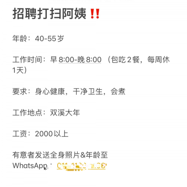 (双溪大年27日讯)居住大马多年的中国籍,近日在脸书招聘打扫阿姨,其薪资和工作范畴起网民不满。
