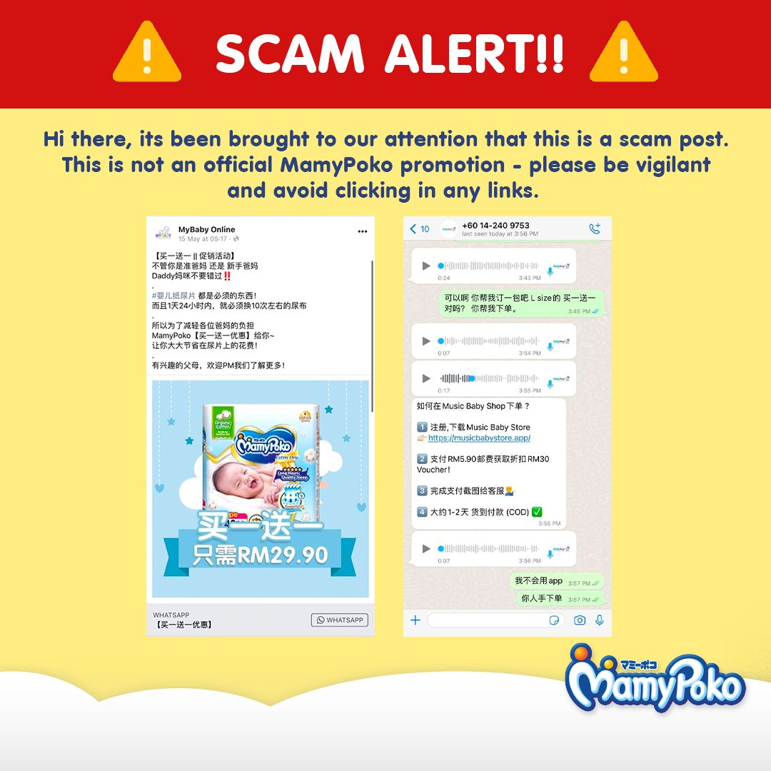 大马MamyPoko在脸书上发文指出,该公司近日发现脸书上有诈骗专页利用其公司品牌的婴儿尿片,在网上以“买一送一促销活动”为诱饵,试图诈骗公众。