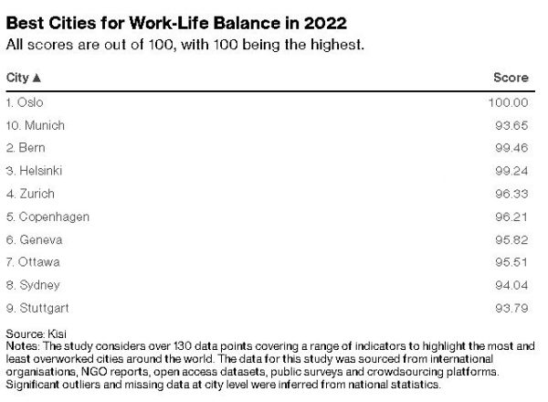 在工作与生活平衡最好的城市中,排名第一的是奥斯陆,得分为100分(最高),其次是伯尔尼以及赫尔辛基,得分均在99分及以上。