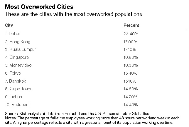 住在迪拜、香港和吉隆坡的人,可能可以考虑到阿姆斯特丹、布宜诺斯艾利斯或悉尼工作,因为调查也显示,这些城市只有不到10%的人口过度劳累。