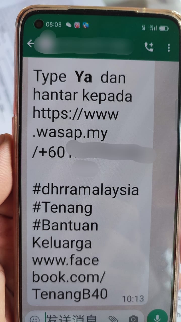 另一方面,士乃区州议员黄勃扬也指出,有民众申诉近来接获陌生手机号码发来的信息,指他们符合有关安定保护券申请,并要求他们回复以进行申请,但他们在还未回复有关信息下却发现身分已被盗用。