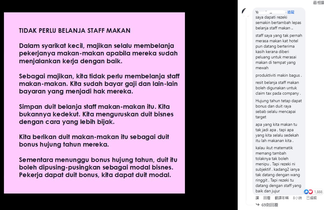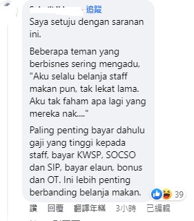 大部分在女老板帖文下的留言都是表示不赞同。相信是小老板的网民反驳说,请员工吃饭后,员工的生产力更高。