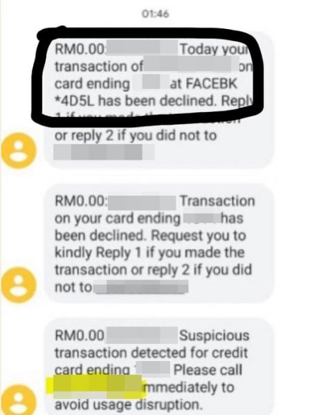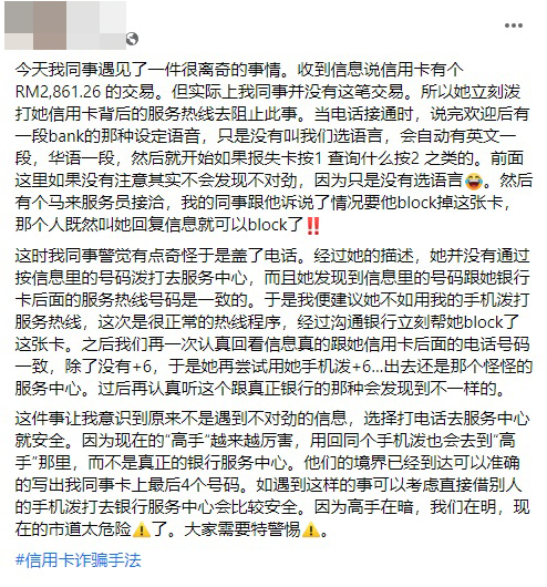 根据帖文内容,发布帖文者是事主的同事,事主向她申诉昨晚收到一则来自银行的短讯,指她有一笔2861令吉26仙的信用卡交易,事主觉得诧异,立刻依据信用卡背面的热线号码致电银行了解情况。