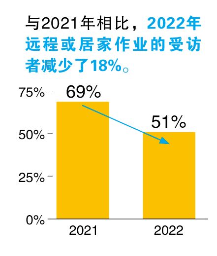 不过,在2022年远程作业的受访者却只有51%,比去年减少了18%,于此同时,54%的受访者指出,他们希望雇主可以提供“弹性工作安排”,协助改善他们的工作与生活平衡。