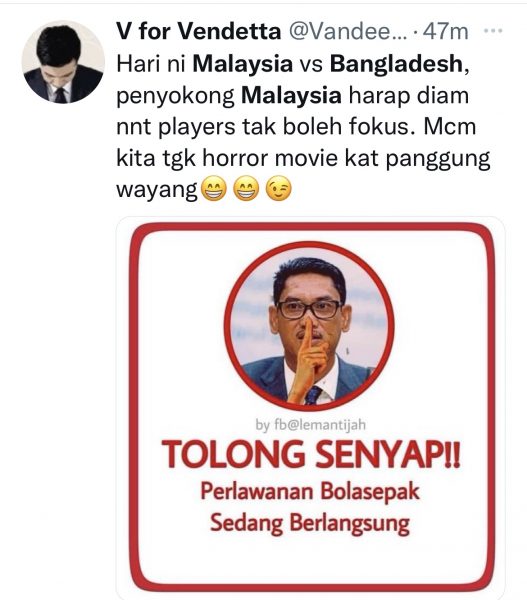 其中一位网民在推特上载恶搞部长的照片,将举起食指的手放在部长阿末法依沙的嘴巴前示意“闭嘴安静”,图中的文字写道:“请安静!足球赛正在进行中。”