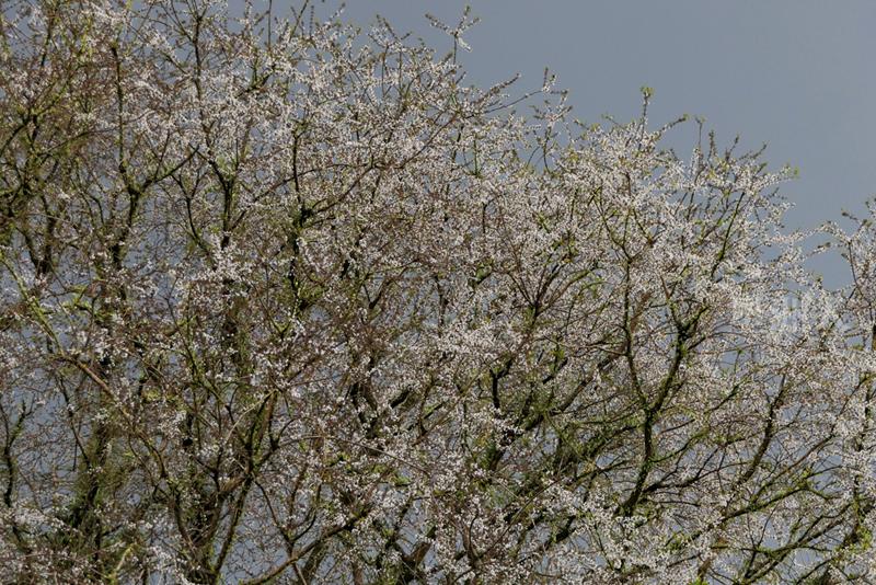 那棵树的花朵只有大约2公分宽,有5瓣,密密麻麻布满于整棵大树的所有细枝上。树上几乎没有绿叶,只有些许红绿色的嫩叶点缀于花丛的末端,于是突显了树木枝干的苍劲,衬托出小白花的柔美。