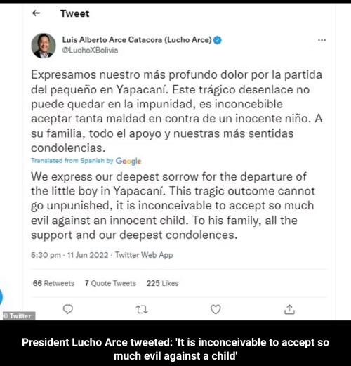 这起强奸案引起玻利维亚举国震惊,该国总统阿尔塞也发文谴责四兄弟的行为,“我们对男童的离世表示最深切的悲痛,罪犯绝不能够逍遥法外。”