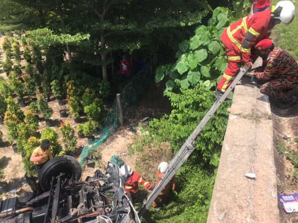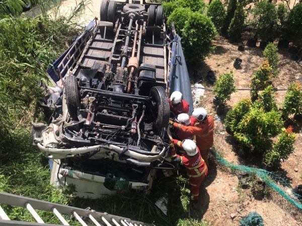他说,车祸发生后,5吨罗里冲进路边约6公尺深的山崖并翻覆,司机凯鲁法哈鲁丁(27岁)受困在司机座位上,被消拯员救出后,到场的救护车队员证实已经没有生命迹象。