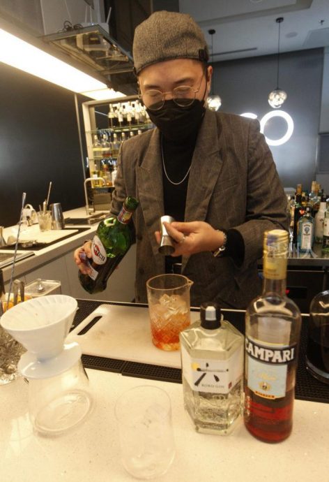 带着心理学背景,陈国强晚间在武吉加里尔柏威年广场的CO2 Coffee Bar时,边享受与顾客聊天边享受调咖啡鸡尾酒。银白色的咖啡馆一到傍晚6点钟就转换格调,那些白天藏在柜子里的各种基酒硄硄当当端上桌,往后瞄去,陈设架上的透明玻璃瓶里盛着调酒师的独家配方。