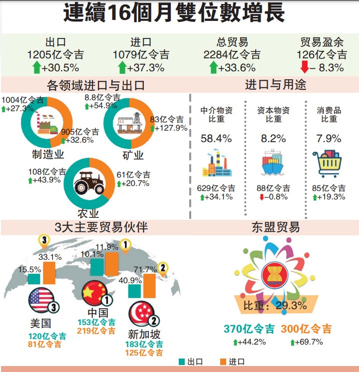 出口和进口扩大,让贸易总额按年增长33.6%至2284亿令吉,连续第16个月获得两位数增长,按月却下跌了1.4%。此外,5月的贸易盈余是126亿令吉,按年减少8.3%,按月减少46.3%。