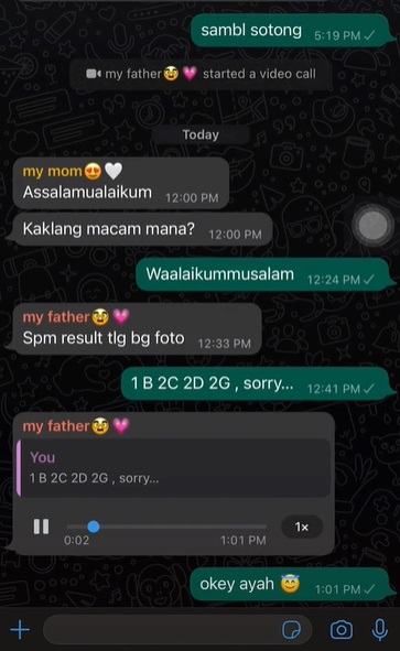 网民Notekin日前在社交媒体上传一段视频,可见她的母亲在家庭WhatsApp群组询问她的大马教育文凭(SPM)成绩。