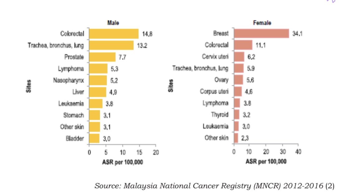 他也附上了国内的癌症数据,本地男性最常患上的癌症是大肠癌,女性则是乳癌,卵巢癌则是在大马女性最常患上的癌症中,排行第5。