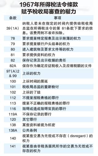 针对税务审查(Tax Audit),1967年所得税法令条款赋予税收局各项权力,请参阅图表。为了取得完整资料以确定一名纳税人士是否应被征税,税收局有权要求纳税人在指定的时间内提呈及出示账簿、账目、特定报表等文件。